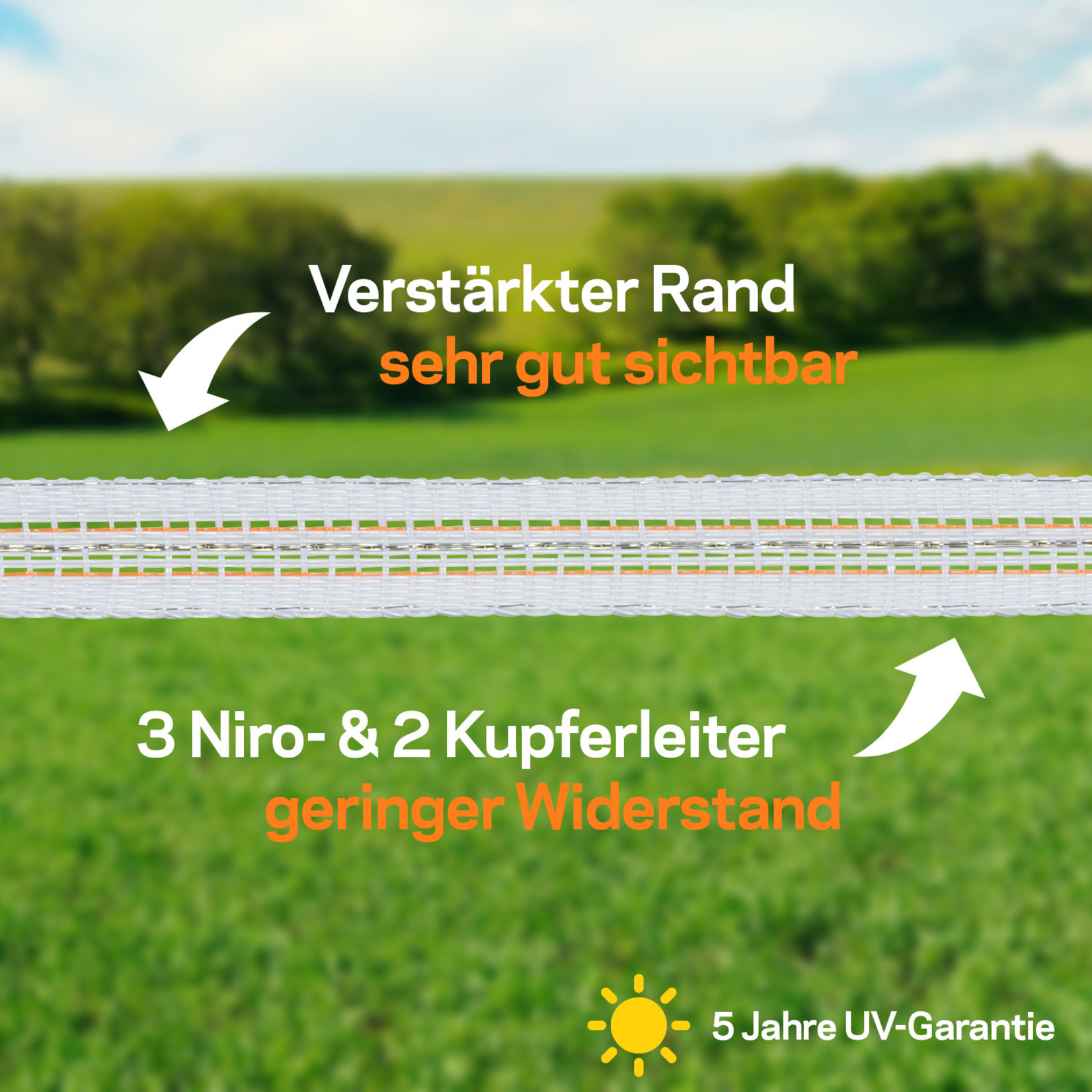 Ruban robuste de 12,5 mm avec 3 fils Inox et 2 fils super conducteurs pour de plus grandes distances. Ces derniers sont reliés entre eux tous les 7 cm par un fil Inox vertical empêchant les ruptures. D'une conductibilité 40 X supérieure au ruban normal de 12,5 mm. Convient également pour des distances supérieures à 500 m. Rouleau de 200 et 400 mètres.